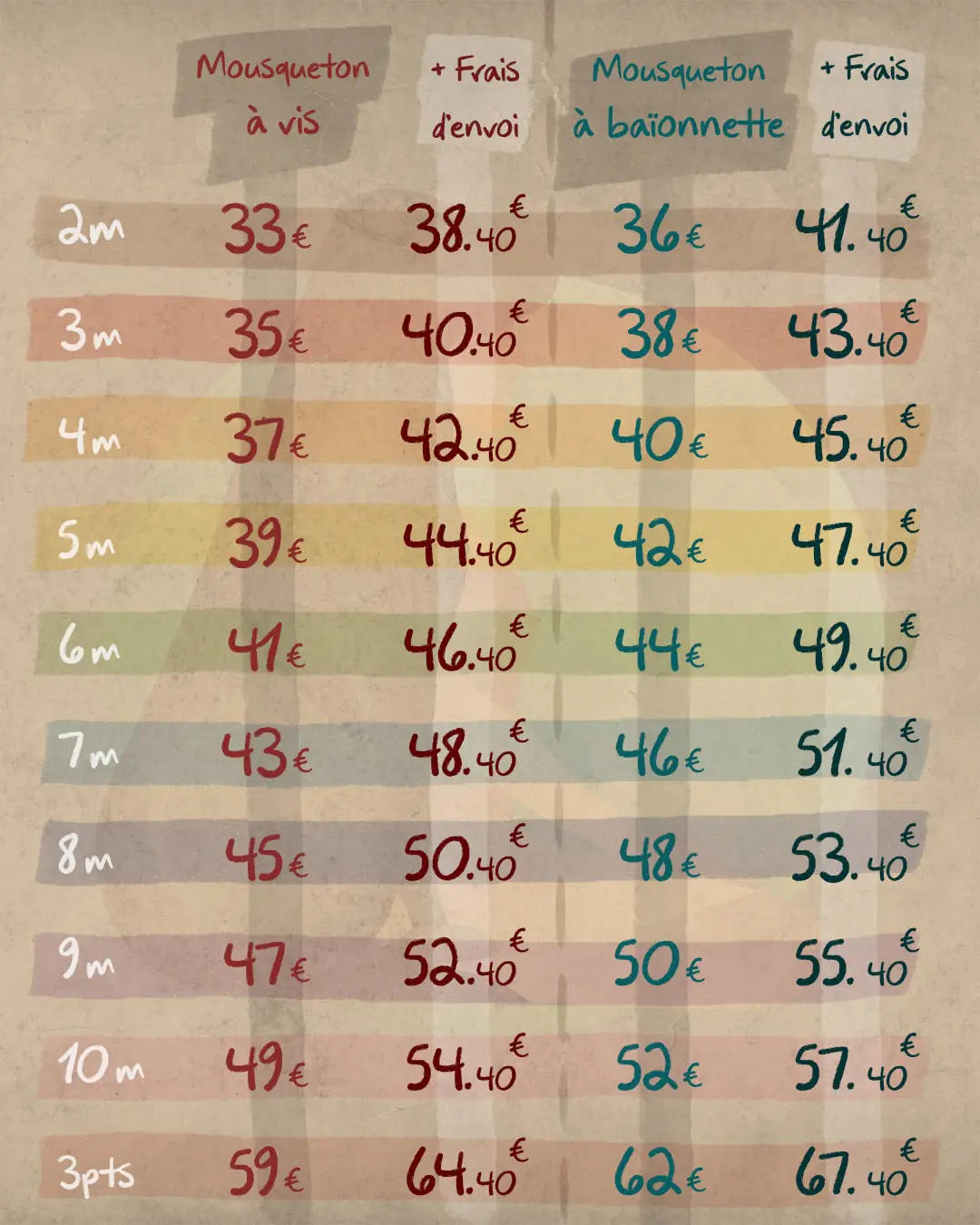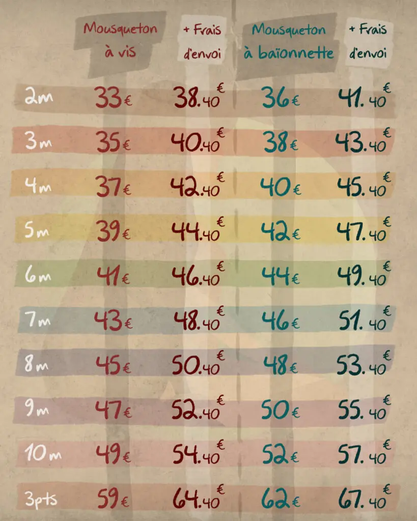 ✨ 33€ les 2 mètres puis 2€ par mètre supplémentaire ✨